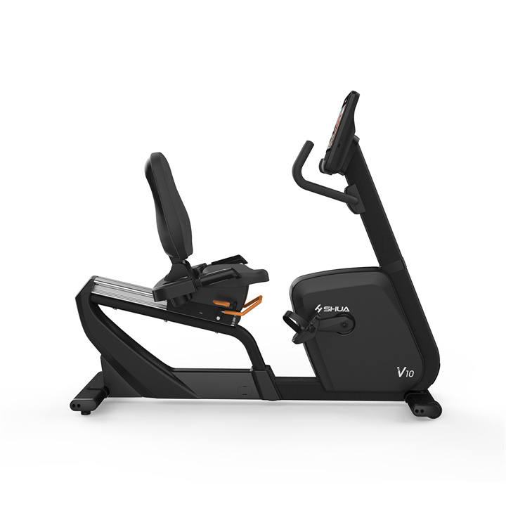 舒华卧式商用健身车SH-B9100U(V10)采用自发电,40段电磁控阻力系统,9.3kg飞轮重量。