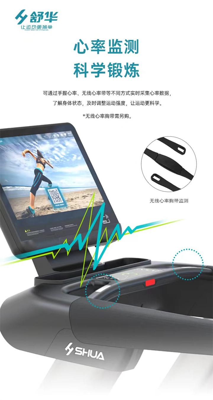 舒华商用跑步机SH-T8919采用t2.2mm黑钻纹(可选配:t2.4免维护跑带)的跑带,,选用手握心率测试 自带心率带及增加心率控速(HRC)程序模块、接触式心率感应测量心跳等数据,跑步面积达580×1570mm,可承受180kg的使用者使用。